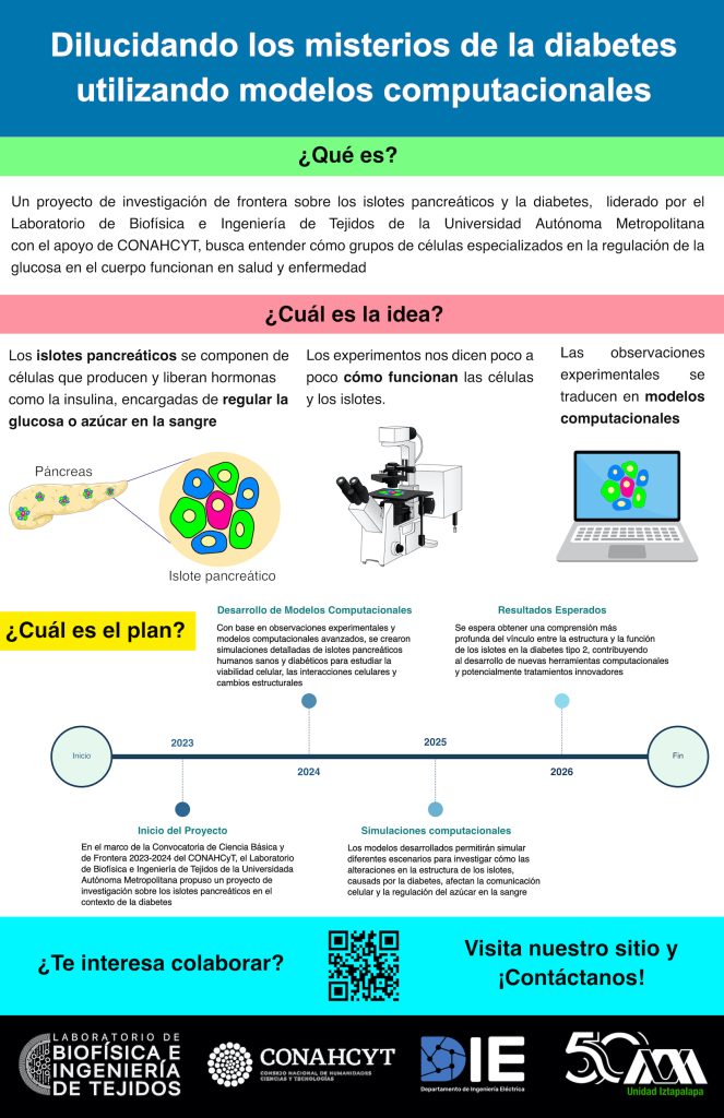 En 2023, recibimos la aprobación de financiamiento de SECIHTI para la realización del proyecto titulado “Implicaciones funcionales del impacto de la diabetes tipo 2 en la arquitectura de los islotes pancreáticos utilizando modelos computacionales” en el marco de la Convocatorioa de Ciencia Básica y de Frontera 2023-2024. En la siguiente infografía se describe de manera general este proyecto, a realizarse en tres etapas anuales, de 2024 a 2026.